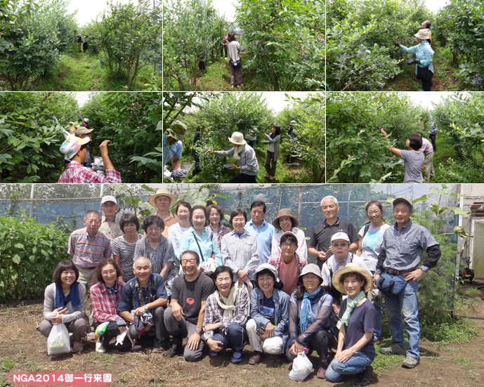 NGAメンバーの来園2グループ目は昨年のクラスを中心に11名。やっと安定した天気になり、昨日も降雨があったが、梅雨明け後から続いた不安定な天気でブルーベリーの品質低下が心配されたが、ちょっと持ち直したようでほっとした。収穫が進むとラビットアイも徐々に小粒になっていくのと雨でブルームがとれるのは仕方がない。しかし、これから晴天が続くので味は乗ってくるだろう。容器にブルーベリー果実と重量の20%の砂糖で抽出していたブルーベリージュースを水で2〜3倍に割り氷を入れて飲んでみたらおいしくなっていた。天然酵母が生きた酵素液だ。ヒムロッドシードレスも徐々に熟しておいしくなってきた。いつもどおり汗びっしょりになり、衣服は全とっかえで着替えてから近くの夢庵に行ってみなさんとお昼を楽しく過ごした。(T)