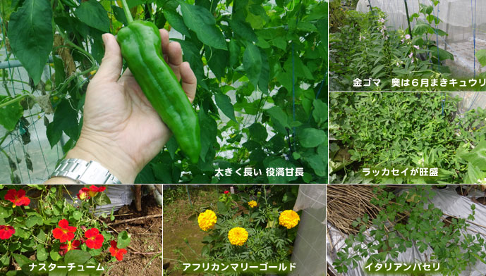 きょうも暑かった。都心では大雨だったようだが練馬は降らなかった。ファミリー農園では役満甘長がなっていた。ピーマンより長く大きいシシトウだが大きくてもやわらかいのが特徴だ。金ゴマが節ごとに花を咲かせながら伸びている。6月まきのキュウリもだいぶ伸びた。区画の角に植えたナスターチュームやマリーゴールドが開花中。エダマメを収穫したあとにイタリアンパセリがのびのびと生育している。(T)