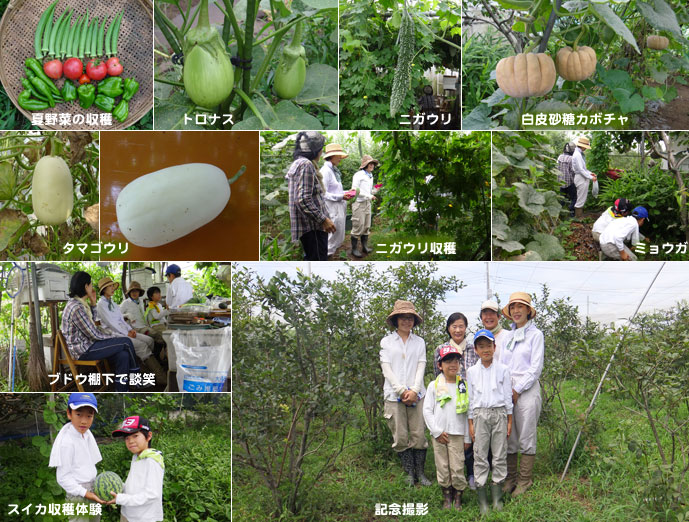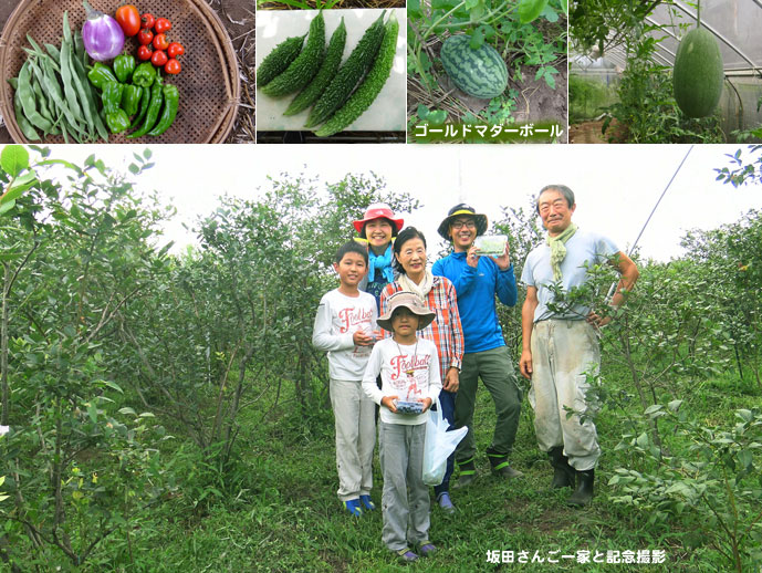 午前中はブルーベリーの収穫。夏野菜も少々収穫した。雨よけハウスではスイカ(ゴールドマダーボール)がなっている。午後はハイブッシュ側の草刈りをした。草生法とはいえ、伸びすぎた草は定期的に少し残して芝刈り風に刈り取っている。3時前に遠路はるばる学研プラスの「野菜だより」編集長の坂田邦雄さんご一家が来園され、奥様と小学5年生と2年生のかわいいご子息がブルーベリーやブドウなどの収穫体験を楽しまれた。記念撮影をした。(T)