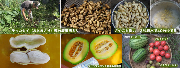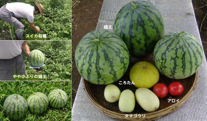遠い農園の柿の木のそばに春に鞍つきを作って植えたスイカ(縞王)がごろごろなっているうちの3個を収穫した。ならせすぎか小ぶりで5.6kgだった。雨よけハウスで熟したころたんメロン、タマゴウリ、アロイトマトを収穫した。