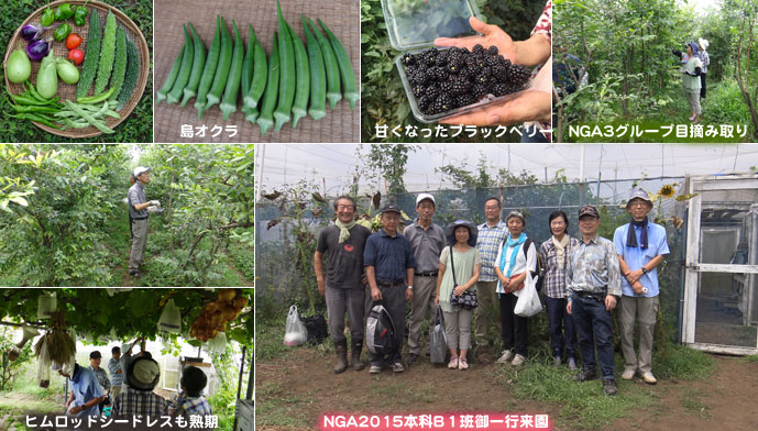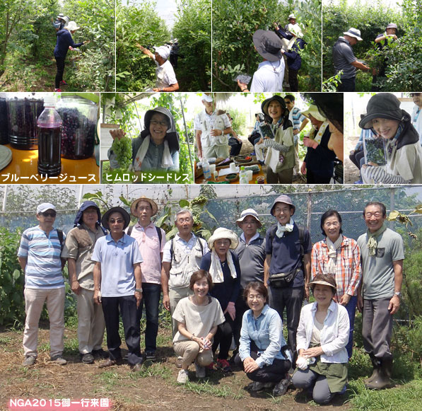 恒例のNGA御一行が来園。きょうは2014年の1班2班を中心とする22名。都内などは降ったようだが、埼玉県日高市は雨は降らなかったので暑かった。いつもどおりフクベリーを含むラビットアイが熟しているので摘み取り体験、ブドウ(ヒムロッドシードレス)の初採りなどを楽しんでもらった。事前に十分捕獲していたのでイラガに刺される人もおらず、無事収穫ができてよかった。お昼は近くの夢庵で楽しく食事をした。(T)