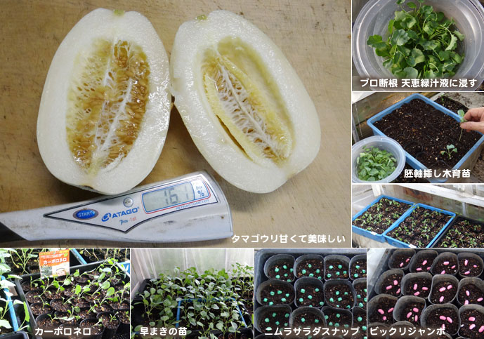 タマゴウリは糖度が高く美味しいマクワウリ。一つから種もいっぱい自家採種できる。7月20日にまいたブロッコリー(しげもり)の本葉が2枚になったので胚軸切断挿し木育苗をした。天恵緑汁液に浸したあと培土を入れた6cmポットに1本ずつ挿した。カーボロネロも6cmポットに移した。早まきのキャベツ、ブロ、カリフラワーはそろそろ植え付けどきになっている。ニムラサラダスナップとビックリジャンボを7.5cmポットにまいた。(T)