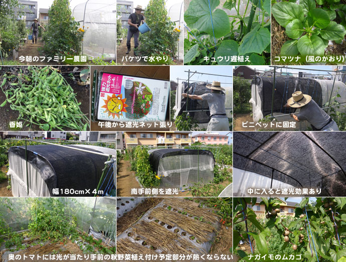 晴天がつづき乾いているので早朝ファミリー農園へ行き、15リットルのバケツで数杯水やりをした。遅植えのキュウリが順調に大きくなっている。守るーむ内ではコマツナ(風のかおり)ができている。そろそろ秋野菜のキャベツ、ブロッコリーカリフラワーを植えるのだが天気予報では植え付けにはかなり厳しい状況で、苗を植えても活着どころか干からびそうなので、マルチの上には敷きわらをして、守るーむの上には南側に遮光ネットを張ることにした。遮光ネットは既製品の180cm×4mのものがぴったりで守るーむのビニペットに固定した。中に入ると強烈な日射が遮られ涼しい。これなら十分効果がありそうだ。(T)