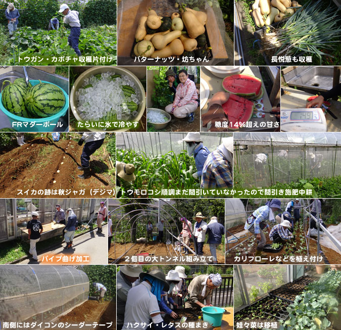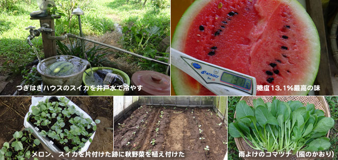 つぎはぎハウス内のメロン、スイカを片付け、秋野菜のキャベツ(デライトボール)ブロッコリー(ジェットドーム)カリフラワー(名月、カリフローレ)を植え、間にはコマツナ(風のかおり)をまいた。収穫したスイカは井戸水で冷やして食べたが、糖度が13.1%で絶品だった。雨よけハウス内のコマツナも収穫した。(T)