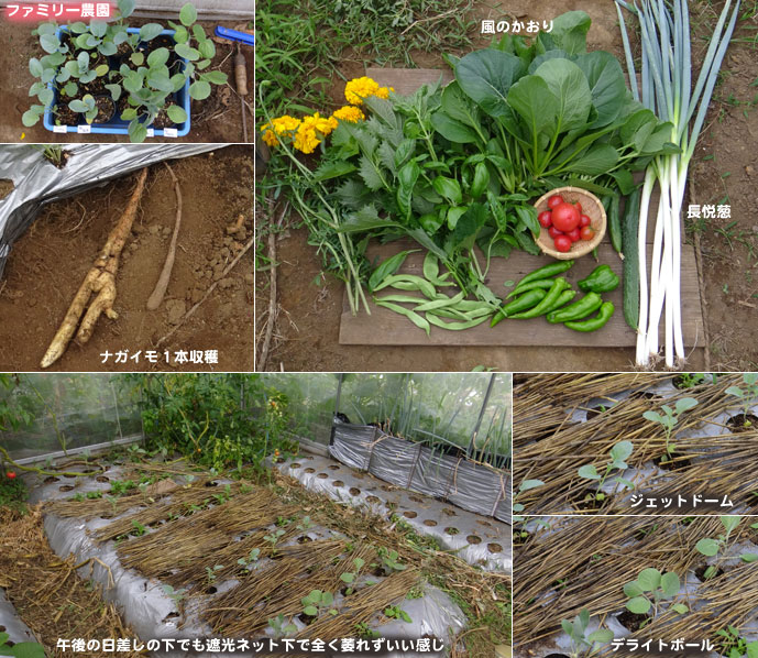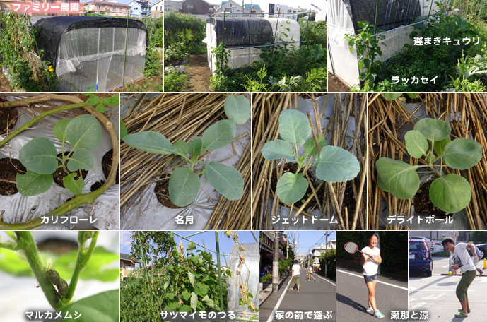 ファミリー農園では台風は恵みの雨だった。遅まきのキュウリが生育旺盛だ。守るーむ内の苗は遮光効果もあり順調に活着している。黒大豆にマルカメムシがいつ行ってもいるのだが、どうやら角のビニペットのスプリングがない部分の隙間から這い上がって中に入って来るようなので隙間を塞いだ。サツマイモのツルが支柱の上まで伸びた。帰ると家の前で涼と瀬那が暑いのにボール遊びをしていた。(T)