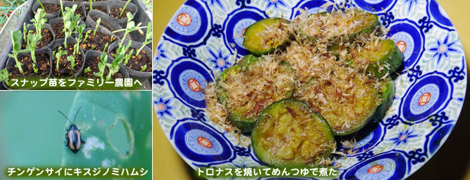 ニムラサラダスナップの苗の一部をファミリー農園へ植えた。守るーむ内のチンゲンサイにキスジノミハムシがいた。全く油断ならない。