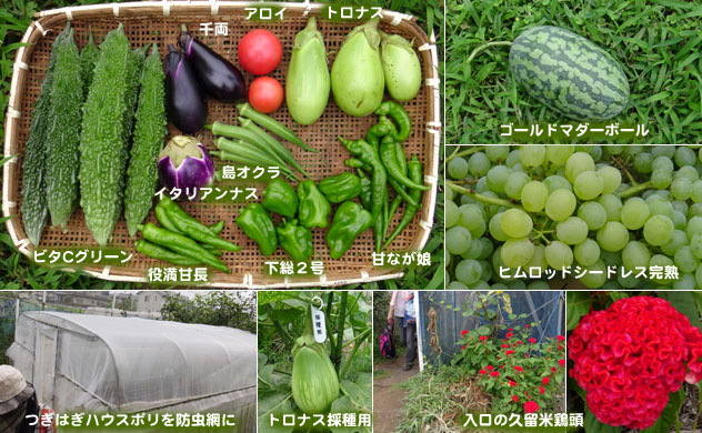 台風が近づき今日は曇天。明日からの雨で今シーズンのブルーベリー果実の収穫もおしまいだ。夏野菜が少しずつとれている。雨よけハウスのゴールドマダーボールを収穫した。ブドウのヒムロッドシードレスが完熟で緑色が赤らんでいる。メロンとスイカの栽培が終わったつぎはぎハウスの天井のポリを外し、防虫網に取り替えた。これで雨が入るので秋野菜が育ちやすくなる。トロナスの採種用果実がどんどん大きくなっている。農園の入口に久留米鶏頭がきれいに咲いている。(T)