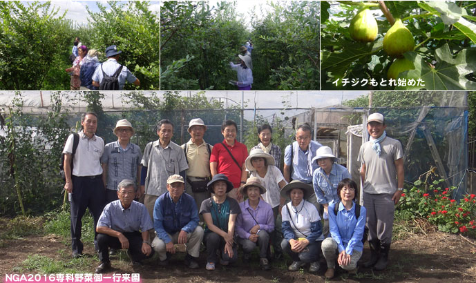NGA関連最終4グループ目は本年の専科野菜13人+果樹1人が来園。不安定な天気が心配されたが、なんとか晴れ間もあり暑かったけどブルーベリーの摘み取りはできた。台風の雨でブルーベリーの裂果もあったが、新しい熟果は稔っていた。イチジクもとれ始めた。ブドウのヒムロッドシードレスはちょうど熟期で良いお土産になった。 (T)