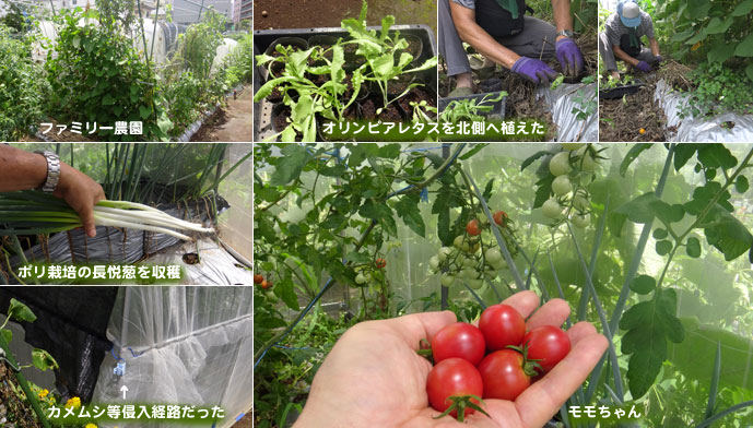 台風が近づき蒸し暑い。ファミリー農園の北側はサツマイモのツルが伸び、生姜が生えているがその北側の畝の肩の部分にオリンピアレタスの苗を植えた。ポリ被覆の長悦葱を少しずつ収穫している。軟白部がよく伸びている。この前気がついた守るーむへのカメムシ等の侵入経路であろうと思われるネットの隙間を塞いだので、きょうはカメムシが1匹もいなかった。ミニトマトのモモちゃんが少しずつとれている。 (T)