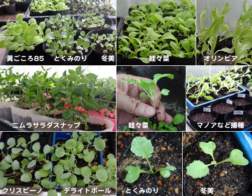 トリプル台風の1つ台風9号が来たので農園へは行かなかった。昼頃館山に上陸し関東を北上、暴風雨になった。目が近づいた頃は一時小康状態になったが、その後も雨が激しく降り続いた。きのう一部をファミリー農園に植えたオリンピアレタスはまだ苗があるので10月どりをめざして遠い農園にも植える予定だ。 温室でマノア、レッドインパルス、大葉春菊の種まきをした。8月7日にまいたハクサイ(娃々菜、黄ごころ85)ブロッコリー(とくみのり)キャベツ(冬美)を7.5cmポットに1本ずつ移植した。ブロッコリーのとくみのりは初めての品種だが、移植時苗の根張りが良く丈夫そうだ。冬美は昨年まいて春先に良いキャベツがとれたのでまた栽培する。スナップエンドウの苗もできている。 (T)