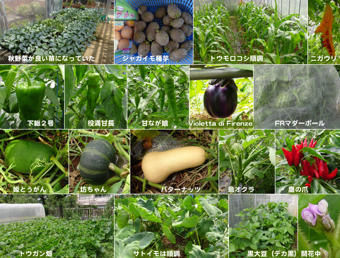 あさってNGAの夏休み実習があるので下見に行った。温室の苗は良くできていた。植えどきだ。秋ジャガの種芋も届いていた。芽がいっぱい出ていた。雨よけハウスのトウモロコシは順調に伸びていた。ニガウリはいくつか熟して割れていた。その他果菜類はつぎつぎとよくなっている。スイカ・トウガン・カボチャの這いづくりは片付けて秋野菜に移行する。畝をリセットしたり、大トンネルも建てる予定なので半日の実習では忙しいが、昨年は9月に持ち越し大変だったので今年は作業分散のため、あさって植えてしまう予定だ。雨でサトイモは生き生きと順調だ。黒大豆に花が咲いていた。(T)