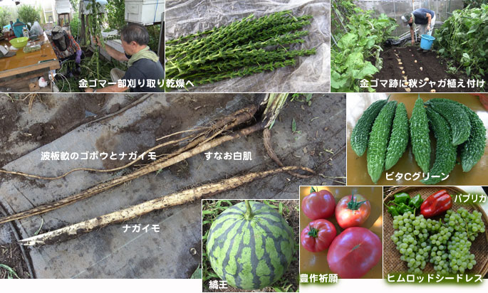 台風で金ゴマが倒れたので一部刈り取り、乾燥に入った。その跡には除草し畝をリセットして秋ジャガ(デジマ)を植えた。マルチは発芽後にかける。波板畝のゴボウとナガイモを初収穫した。波板に沿ってまっすぐ伸びていた。ニガウリはつぎつぎと、スイカは2番なり、トマト(豊作祈願)、パプリカ(ソニアミックス)、ブドウ(ヒムロッドシードレス)を収穫した。イチジクは雨だと割れてすぐに腐ってしまうので収穫できない。秋晴れで良品を期待したい。(T)