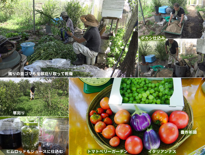 台風が来てブルーベリーシーズンも終わりホッと一息。しっかり真夏の太陽が照りつける中、ブドウ棚の下の日陰は快適だ。時折吹く風が気持ちいい。ブルーベリーの次は野菜モードに切り替えだ。台風で倒される前に残りの金ゴマを全部刈り取って乾燥に入った。ボカシがなくなりそうなので仕込んだ。園の草刈りを少しした。ヒムロッドシードレスが甘いので一瓶ジュース用に仕込んだ。トマトの豊作祈願が台風で落下する前に早めの収穫をした。(T)