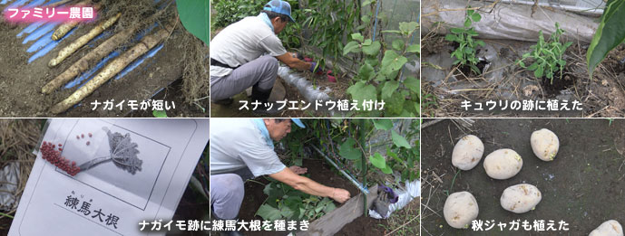 今日は朝から雨模様。ファミリー農園の波板栽培のナガイモとゴボウは正常な生育ではなかった。原因は波板の上にマルチを張ったため中の土が予想以上にからからに乾いていた。ゴボウなどは根がほとんど伸びていなかった。ナガイモは短いながら少しはできていたが失敗だ。スナップエンドウの苗をキュウリの跡に植えた。ナガイモの跡は再び土を波板の上に戻し、今度はマルチを外して練馬区からもらった練馬大根をまいた。波板に沿って根が80cm伸びる予定。春ジャガの跡に秋ジャガも植えた。(T)