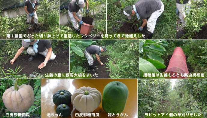 台風の影響で不安定な天気だった。ときおり射す太陽の光は真夏の強烈さだった。以前フクベリーを間引いて第1農園へ移植していたが、生育が悪いので昨年ぶった切って大鉢に移植していたら、見事に復活したので、絶対量が少ないフクベリーを増やすため、6株全部を猿田に戻して、ハイブッシュ側に移植した。来年から結実する。土佐大生姜の南側のゴマの跡に土を盛り高畝にして練馬大根の種をまいた。生姜もろとも防虫網トンネルをかけた。白皮砂糖南瓜、坊ちゃんカボチャ、姫とうがんを収穫した。ラビットアイ側の草刈りをした。(T)
