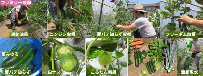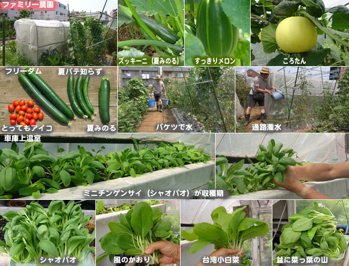 すっかり真夏のファミリー農園。強い日差しが照りつける。ニンジン(ベーターリッチ)を収穫。5月に植えたおうち野菜シリーズのうちキュウリ(夏バテ知らず)とズッキーニ(夏みのる)が取れ始めた。フリーダム、セロリ、カーボロネロ、青しそ、白ナスもとれた。ころたんメロンは2個なっている。