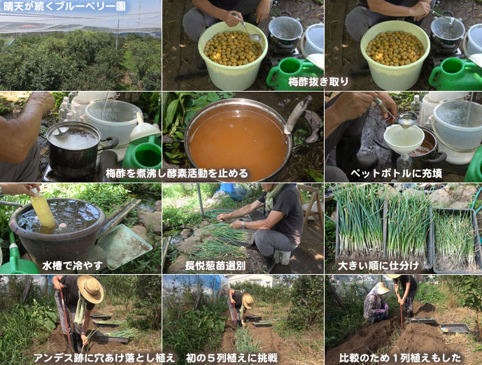 梅雨明けで晴天がつづくのできょうもブルーベリー摘みをした。梅酢を鍋一杯分抜き取り、煮沸して発酵しないようにしてペットボトルに詰めた。残りの梅は車で練馬へ持ち帰った。明日天日干しをする。長悦葱苗を抜き取り大きい順に選別してアンデスの収穫跡に穴あけ落とし植えで、初の5列植えをしてみた。比較のため1列植えもした。地上部は板枠でなく、一般的な土寄せ方式で栽培する。一時さび病が発生したが、キチン質酢の100倍を噴霧したら、完全に止まり、新葉には発病は見られなかった。キチン質酢の威力はすごい。
