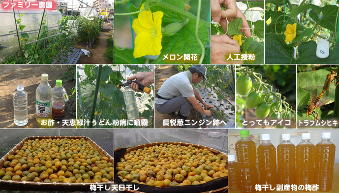 早朝、メロン(すっきり)の授粉のためファミリー農園へ行った。おとといの蕾から予想した通り、今日咲いていた。人工授粉した。メロンの下葉にうどん粉病が出始めたのでお酢と天恵緑汁を薄めて葉の表裏に噴霧した。きのう遠い農園から持ってきた葱苗(長悦葱)の細いのをニンジンの収穫跡に穴あけ落とし植えした。ミニトマト(とってもアイコ)が大きくなってきた。トラフムシヒキが交尾していた。肉食のアブで害虫退治をしてくれる。梅を例年より早く天日干しした。大きな梅ざる2つでは間に合わず、小さなお盆も総動員して干した。きのうも取ったが、同じぐらいの梅酢がまた取れたので煮沸してペットボトルに充填した。