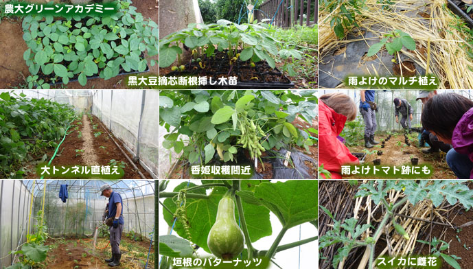 NGAは、雨天実習だった。黒大豆苗の植え付けがメインで跡は管理作業だった。黒大豆(デカ黒)は大トンネルに株間40cmで2条。雨よけトンネル内にはマルチの両肩に45cm間隔と、トマトを片付けた跡に大トンネルと同じようにマルチなしで植えた。枝豆(香姫)は来週あたりが収穫適期だ。垣根のバターナッツがなりはじめた。スイカにやっと雌花が見えてきた。(T)