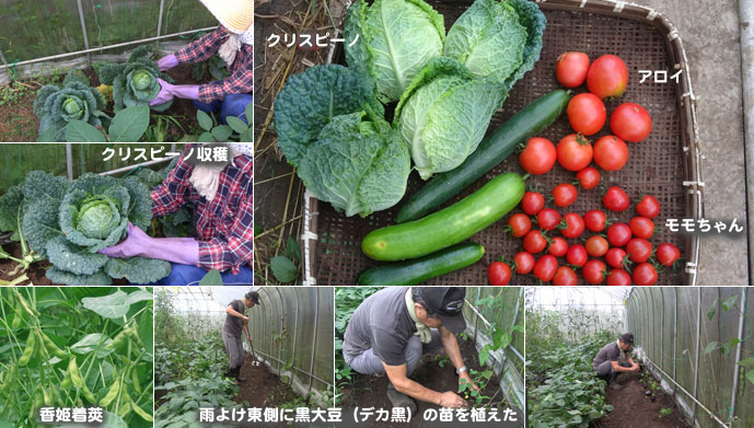 雨だったが農園へ、午後にでも止んだらブルーベリーを収穫しようと思っていたが、全く止まずに雨は降り続いたのでやめた。全く梅雨に逆戻りだ。雨が降るわりに高麗川の水位は全く上がっていなかった。雨よけハウス内の作業をした。キャベツ(クリスピーノ)トウモロコシ(サニーショコラ)トマト(アロイ、モモちゃん)キュウリ(フリーダム、ミドルQ)など収穫、草取り、東側に黒大豆(デカ黒)の苗植えをした。(T)