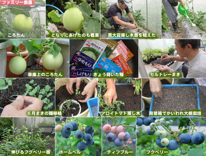 ファミリー農園のころたんも大きくなっている。隣の区画にあげたころたんもなっている。黒大豆苗を植えた。車庫上のころたんも大きくなっている。秋野菜の種をセルトレーにまいた。6月まきのキャベツの移植をした。アロイトマトの挿し木をした。育苗箱にかいわれ大根をまいた。車庫上のフクベリーの苗が伸びている。今年は色づきが早く、ラビットアイ全部が色づきはじめている。フクベリーの色づいた果実は大きい。