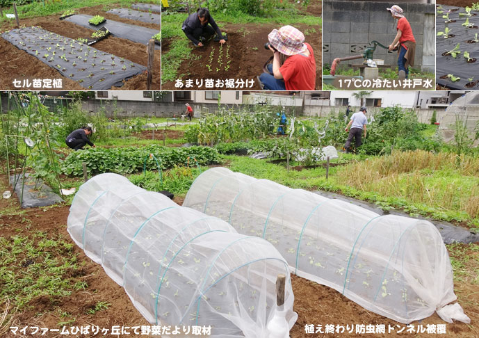 2度目の梅雨明けのように暑くなった。車庫上温室で育苗していたセルトレー苗を野菜だよりの取材で車で20分のマイファームひばりヶ丘に植えに行った。野菜だよりの編プロ「たねまき舎」では当農園に区画があり、そこへ苗を植えた。まずは草刈り、草を地中に埋めてから無肥料で畝立て、9515を張って、いろいろな菜っ葉類の苗を植え付けた。苗は余分にあったのでお裾分けし、マルチなしで植えた。園内には手押しの井戸があり、水温17℃の冷たい水が出るのが嬉しい。早朝から行ったので11時頃には作業は終了した。(T)