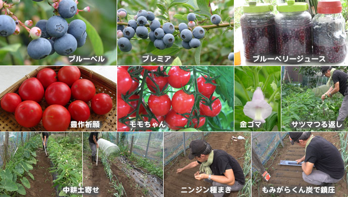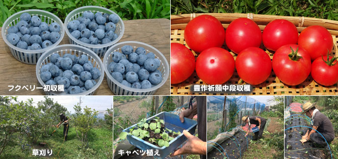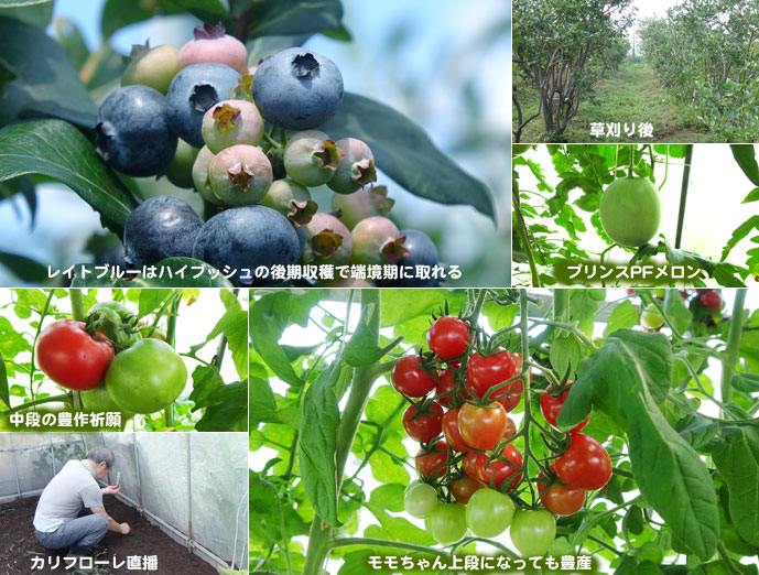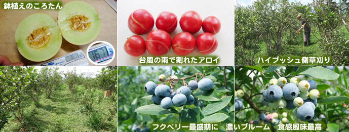 雨で中断していたブルーベリーの収穫を再開した。この時期はラビットアイの前でハイブッシュの早生種が終わる端境期になるのだが、レイトブルー、オザークブルー、レガシー、サミットなどのハイブッシュの晩生種で収穫がつながる。中でもレイトブルーは収量も多く長く取れるのが良い。ハイブッシュ側の草を刈った。プリンスPFメロンがなっている。豊作祈願トマトも中段になってきた。モモちゃんは既に上段も色づき始めているが、美味しく豊産種で良い。つぎはぎハウス内の草を刈りカリフローレを直播してみた。(T)