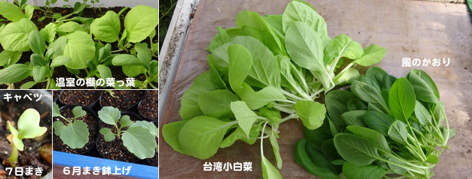 今日も猛暑だった。温室の棚では台湾小白菜と小松菜(風のかおり)を収穫した。7日にセルトレーにまいたキャベツ(秋空)の芽がもう出ている。6月23日まきで先日鉢上げしたキャベツ(輝)は本葉2枚で育っている。(T)