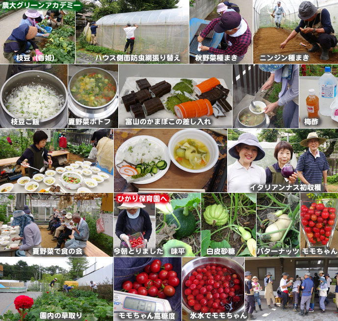 夜明けの豪雨はビックリだったが、8時頃には止んだ。NGAは、ハウスの防虫網張り替え、キャベツ、ブロッコリー、カリフラワーのセルトレーへの種まき、ニンジンの溝底播種をした。食の会は枝豆ご飯、夏野菜のポトフ、夏野菜の即席梅酢和えサラダ、差し入れのかまぼこなどで美味しく味わった。午後、ひかり保育園に行った。カボチャが何種類もなっていた。サツマイモはすでにつる返しがしてあった。春に2株植えたミニトマト(モモちゃん)が無整枝放任地這い栽培でよくでき、たくさんの果実が収穫できていた。糖度を測るとなんと13.8%と高糖度。いっぱいあった取り残しを収穫すると食堂で氷水で冷やされてでてきた。冷やしトマトがまた美味しかった。(T)