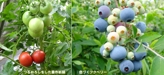 猛暑がつづくということはブルーベリーの果実はおいしくなる都いうことでもある。例年より早くフクベリーの味が乗ってきた。糖度を測れば20%超え。ブルームが濃く、初期なりは特に大きい実が取れる。今年のブルーベリーはハイブッシュもラビットアイも昨年に比べ豊産だ。天気にも恵まれ美味しい果実がまだまだなり続くだろう。きょうは収穫後1時間ほど自動潅水をした。ミニトマト(モモちゃん)は上段収穫になったが、粒ぞろいもよく味の良い実がとれている。(T)