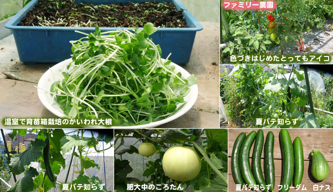 車庫上温室で育苗箱に培土を入れて1週間前に種を蒔いたかいわれ大根を収穫した。最も早く取れる野菜だ。生のままサラダで食べるとおいしい。ファミリー農園ではミニトマト(とってもアイコ)が色づき始めていた。キュウリ(夏バテ知らず、フリーダム)も1週間ぶりで巨大化していた。ころたんメロンも肥大中。白ナスも収穫した。(T)