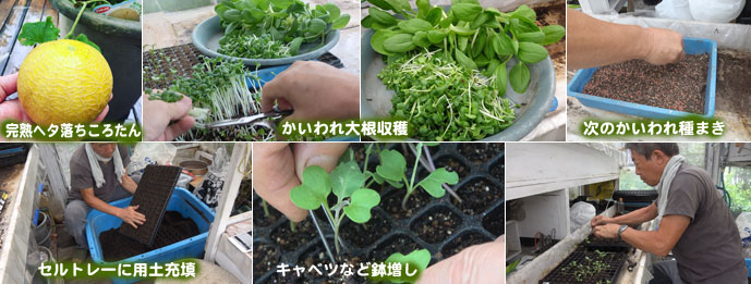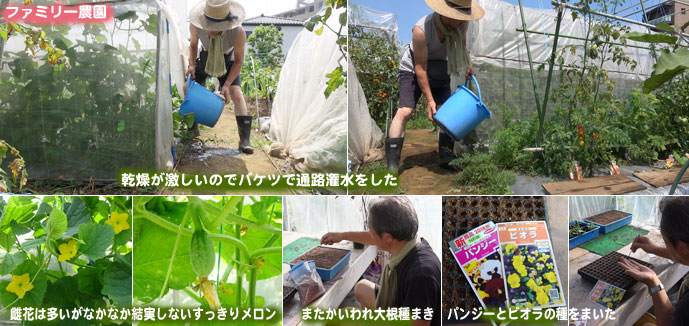 きょうも猛暑。ファミリー農園、ついにバケツで通路潅水をした。昨日取り残しのキュリも収穫した。すっきりメロンの雌花はいっぱい作画なかなか結実肥大しない。かいわれ大根がすぐできるので温室で育苗箱にまた種まきをした。パンジーとビオラをセルトレーに種まきした。(T)