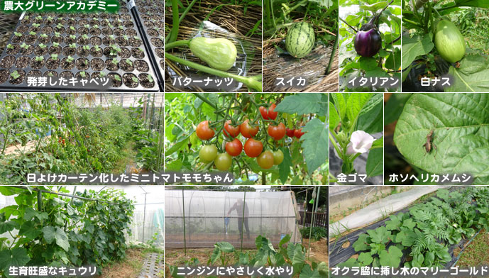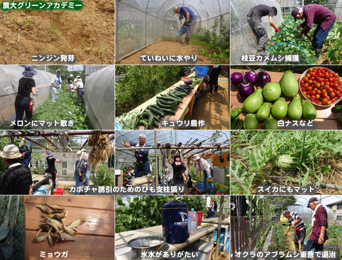 NGAは、猛暑の中の実習だった。当番さんの水やりの成果でニンジンが発芽した。じょうろで丁寧に水をやる。トンネルの枝豆にカメムシがいたので月曜日にトンネルを開放していた。まだいるホソヘリカメムシを捕獲退治した。メロン(プリンスPF、タマゴウリ)にマットを敷いた。いっぱいなっている。キュウリが豊作だ。白ナスやイタリアンナスもとれている。作業台上に南瓜を誘引するためひも支柱を張った。スイカにもマットを敷いた。北側のミョウガも少しずつとれている。今日は氷ジャーが登場。冷水がおいしかった。オクラにアブラムシがいたので重曹液を噴霧した。(T)