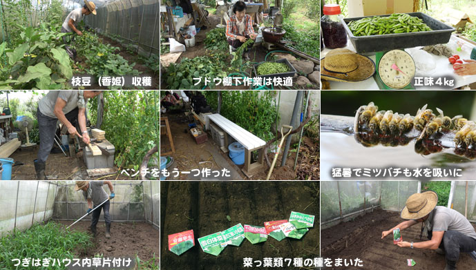 雨よけハウス内で栽培していた中生の枝豆(香姫)を初収穫した。2×4材でもう一つベンチを作った。猛暑でミツバチも水を吸いに来ていた。つぎはぎハウス内の草を片付け溝つけ君で菜っ葉類(はまみなとべかな、パーマグリーン、風のかおり、台湾小白菜、きよすみ、雪白体菜、安藤早生小松菜)を溝底播種した。