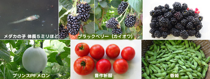 遠い農園の池ではメダカの子がいっぱい生まれてスイスイ泳いでいる。体長は数ミリしかないのだが、アップしてみると目が青く見える。ブラックベリーのカイオワが熟したので収穫した。巨大な果実は魅力だが、樹にトゲがあるのが残念だ。右上の赤いのはラズベリー少々。プリンスPFメロンが美しく肥大中。トマト(豊作祈願)枝豆(香姫)を収穫した。(T)