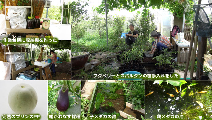 作業台横にしっかりした棚を作った。作業台が広く使えるようになった。第1農園から運んできたフクベリーとスパルタンの苗の手入れをした。プリンスPFメロンが完熟でヘタ落ちした。絹かわなすの採種果が大きくなっている。子メダカの池と親メダカの池は別にしている。小さいうちは親が子メダカを食べてしまうことがあるという。(T)