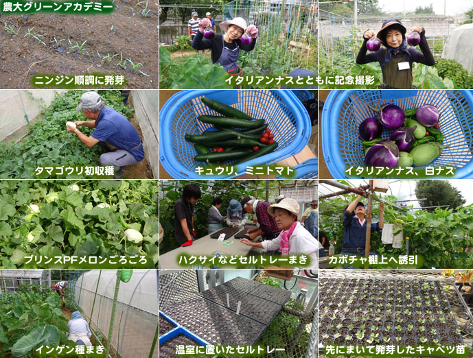 NGAは、ちょっと暑さも和らいだ。ニンジンも順調に発芽した。イタリアンナスがつぎつぎととれはじめ記念撮影。タマゴウリを初収穫した。キュウリ、ミニトマト、ナスの収穫が続く。プリンスPFメロンがゴロゴロなっている。来週はとれそうだ。セルトレーにハクサイ(タイニーシュシュ)チンゲンサイ(シャオパオ)コールラビ(グランドデューク、アスルスター)を1粒ずつまいた。カボチャ(白皮砂糖南瓜)を作業台上に誘引した。インゲン(ビックリジャンボ、鴨川グリーン)をまいた。セルトレーは温室自動潅水下に置いた。12日にまいたキャベツなどは芽が出て本葉も見え始めている。来週はポットに移植できそうだ。(T)