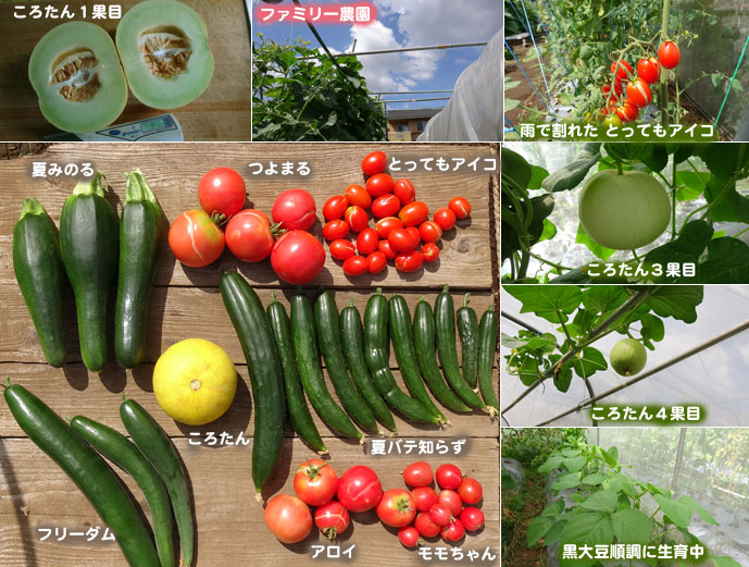 26日にヘタ落ちしていたころたんを切ってみた。糖度は14.6%だった。午前中台風の余波で雨が降ったり不安定だったが午後はまた日差しが照りつけ暑くなった。台風の雨でトマトがかなり割れた。ころたん2果目もヘタ落ちしていた。その他収穫はズッキーニ(夏みのる)キュウリ(フリーダム、夏バテ知らず)トマト(つよまる、とってもアイコ、アロイ、モモちゃん)ころたんにはまだ3番果、4番果がなっている。黒大豆が順調に伸びている。今年はカメムシには食わせない。 (T)
