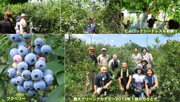 毎年恒例の農大OBの来園、一番乗りは2013年の1班(あやめ雪の会として活動)豊作のブルーベリーはフクベリーのほかいろいろ味見をしながら摘み取りを楽しみ、ブドウのヒムロッドシードレスの初採りもした。ヒムロッドシードレスの房には1kgに迫るものもあった。もう糖度も十分乗っている。猛暑の中で汗をびっしょりかいた後はいつもの通り近くの夢庵で会食、冷たいビールが美味しかった。(T)