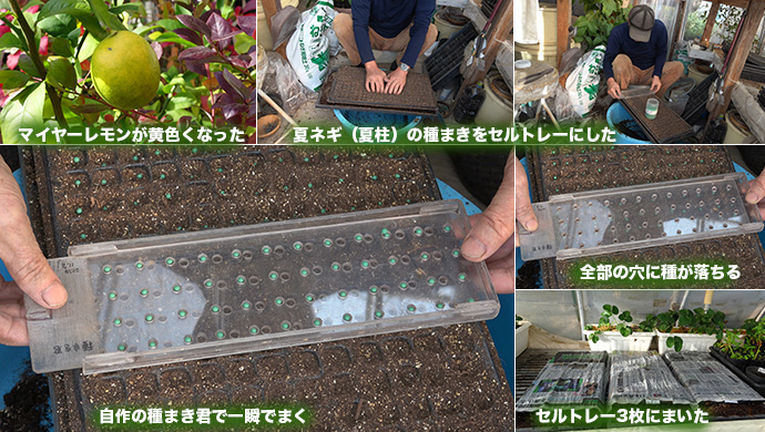 車庫上のマイヤーレモンが黄色くなってきた。車庫上温室内でネギ(夏柱)の種を昨年自作した種まき君で288穴セルトレー3枚にまいた。