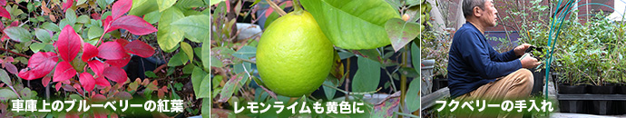 車庫上のハイブッシュブルーベリーが鮮やかに紅葉している。マイヤーレモンに続き、レモンライムも黄色くなってきた。フクベリーの苗の手入れをした。 (T)
