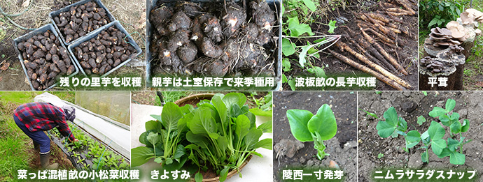 残っていた里芋を全部収穫した。18kgあった。親芋は土室保存して来季の種用にする。波板畝の長芋とゴボウを収穫した。平茸が発生している。菜っぱの混植畝の小松菜の収穫を始めた。ハウスのソラマメ(陵西一寸)エンドウ(ニムラサラダスナップ)が発芽している。 (T)