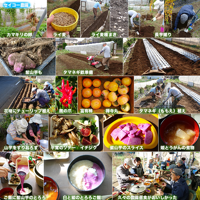 ライ麦の種まきをした。長芋と紫山芋を掘った。タマネギの畝立てをした。花壇にチューリップを植えた。鷹の爪が真っ赤。残りの柿を全部収穫した。タマネギ畝に中晩生のアイドルももえを植えた。山芋も取れたのでお昼は久しぶりに農園で食べることにした。平茸のソテーも美味しかった。紫山芋はとろろのほかスライスもサクサクして美味しかった。姫とうがんの煮物も美味しかった。メインは新米ご飯に2色のとろろかけ、色合いもきれいで美味しかった。久々の農園昼食だった。 (T)