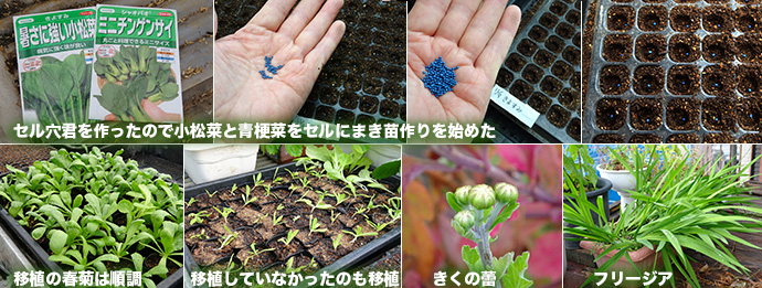 今日は雨でアグリス成城勤務はお休み。先日セル苗植え用穴あけ具(セル穴君)を作ったので、温室でセルトレーに小松菜(きよすみ)と青梗菜(シャオパオ)をまき、セル苗作りを始めた。以前に移植した春菊(菊之助)は大きく育っているが、移植せずに残っていた苗があったので、6cmポットに移植した。きくの蕾が膨らんだ。フリージアの葉も茂っている。