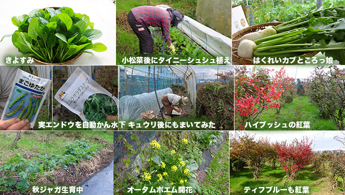 菜っぱ畝の小松菜(きよすみ)の残りを収穫して、収穫後にタイニーシュシュのセル苗を植えた。はくれいカブところっ娘大根を収穫した。自動潅水下のキュウリの後に実エンドウ(まごゆたか、ニムラサラダスナップ)をまいた。ハイブッシュがきれいに紅葉している。秋ジャガが生育中、オータムポエムが咲き始めている。ティフブルーも紅葉している。