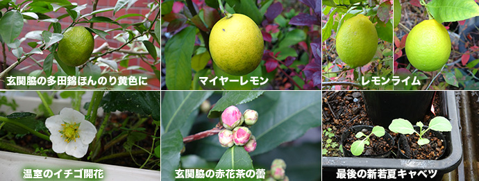 玄関脇のユズ(多田錦)がほんのり黄色くなってきた。車庫上のマイヤーレモンはかなり黄色が濃くなった。レモンライムも黄色い。温室のイチゴの花が咲いた。玄関脇の赤花茶の蕾が膨らんだ。最後の新若夏2本を6cmポットへ移植した。 (T)