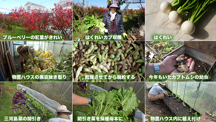 晴れるとブルーベリーの紅葉が鮮やか。はくれいカブを収穫した。物置ハウスの黒豆を抜き取り莢を外した。堆肥枠内には今年も太ったカブトムシの幼虫がいた。菜っぱ畝の三河島菜を間引きその一部を採種母本として物置ハウス内に植えた。