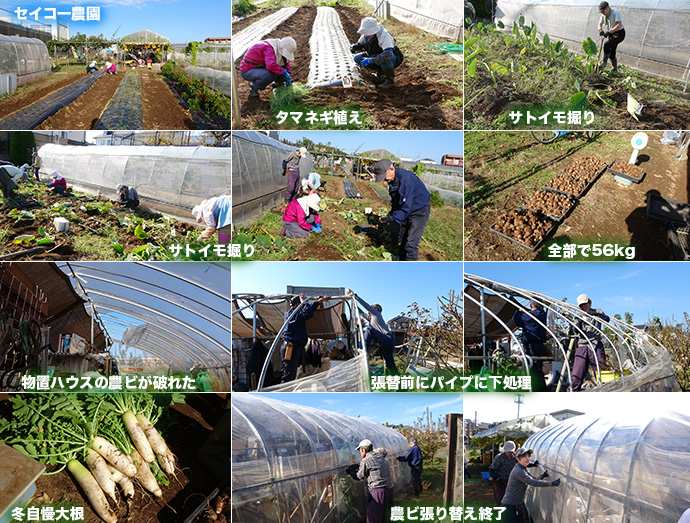 小春日和の良い天気だった。タマネギ(アトン)を少し植えた。里芋を全部収穫した。夏の乾燥で茎葉の生育が小さかった分、芋も小芋だったが、3畝で56kgの収穫だった。物置ハウスの農ビが破れたので張り替えた。パイプの設置面から破れるので張る前にパイp全体に古ビニールを巻いてその上から新しい農ビを張った。この下処理で長持ちさせたい。冬自慢を収穫した。下処理に時間がかかったが、農ビの展張は順調に終わった。