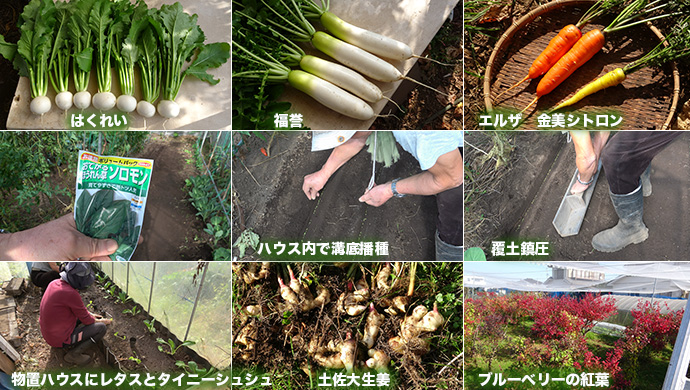 はくれいカブ、福誉大根、ニンジン(エルザ、金美シトロン)を収穫した。ホウレンソウ(ソロモン)をハウスの黒豆跡に溝底播種した。物置ハウスの三河島菜の前にレタス(キングクラウン)とタイニーシュシュを植えた。土佐大生姜も収穫した。ブルーベリーの紅葉がきれい。