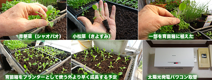 セルトレー育苗の小松菜と青梗菜が植えどきになった。その一部を育苗箱をプランターにして植え付けた。外よりは早く収穫できるだろう。20年間使っていた太陽光発電のパワーコンディショナーが壊れたので取替工事をしてもらった。 (T)